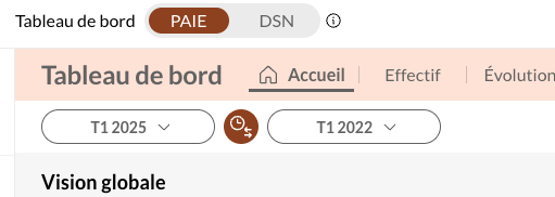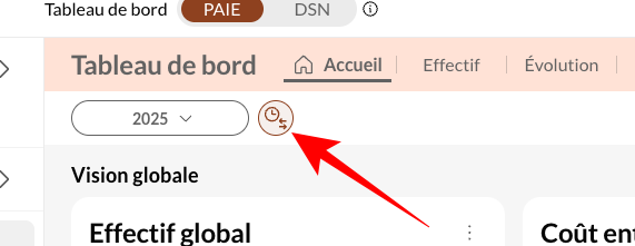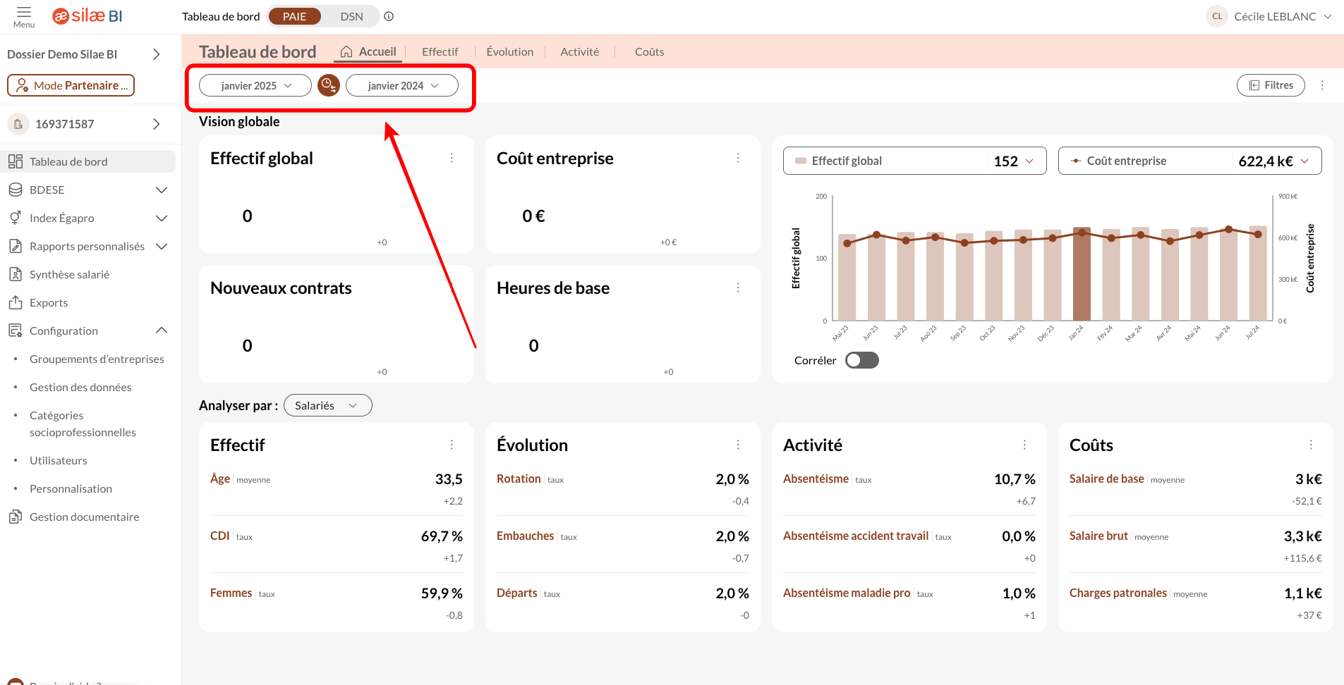 Avec les nouveaux tableaux de bord de Silae BI, vous pouvez choisir directement la période d'analyse que vous souhaitez. Pour cela, il vous suffit de cliquer sur les dates, en haut à gauche de votre écran.