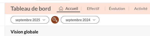 Lorsque vous choisissez de comparer vos données mensuelles, la plate-forme vous proposera de les comparer au mois de votre choix, il faudra venir sélectionner l'autre mois au niveau du deuxième sélecteur.