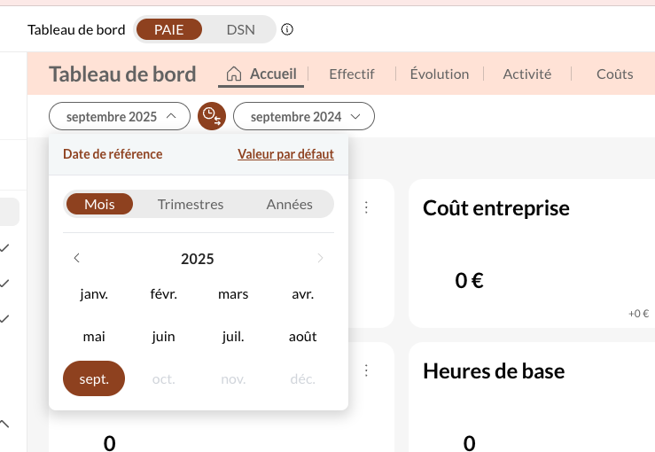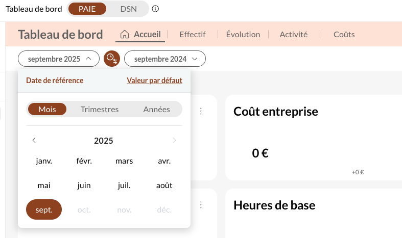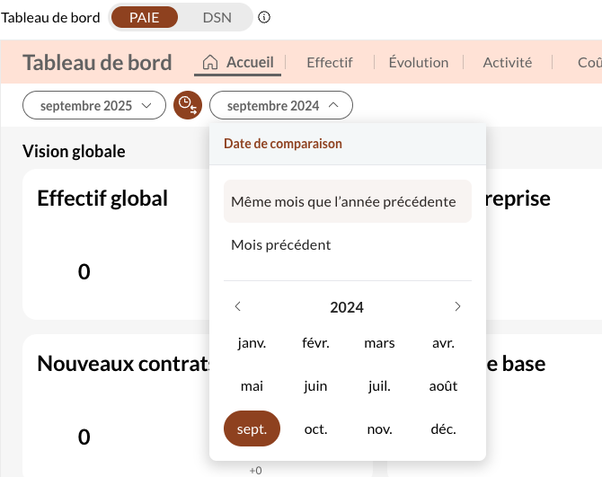 Par défaut, la plate-forme sélectionnera le dernier mois pour lequel vos données de paie se sont synchronisées, et le comparera avec le même mois, l'année précédente :