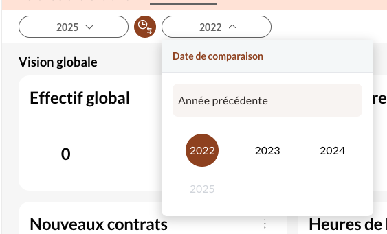 En choisissant le filtre "Année", vous pourrez comparer vos données de l'année en cours avec celles d'une des années précédentes (en fonction des données présentes au sein du compte) :
