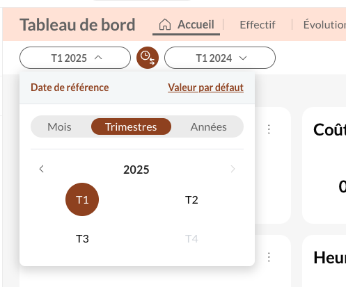 Lorsque vous choisissez le trimestre souhaité, celui-ci sera automatiquement comparé avec le même trimestre l'année précédente (T1 avec T1, T2 avec T2...)